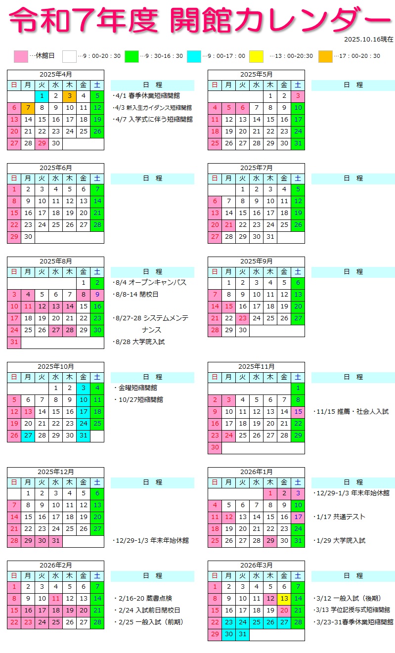 ※下表のほか臨時休館や、閉館時間が変更になる場合があります。”お知らせ”でご確認ください。 update:2025.10.16